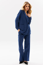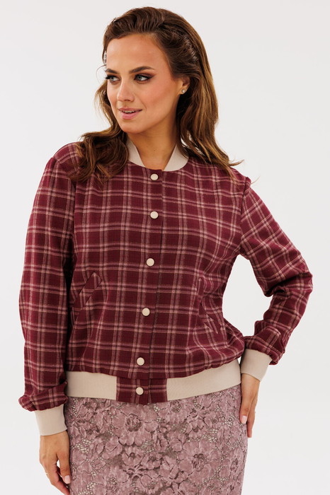 Жакет-бомбер женский прямого силуэта, с притачной манжетой понизу, без подкладки. Горловина округлая с втачной стойкой. По переду центральная застежка на кнопки и наклонные прорезные карманы с листочкой. Рукава длинные втачные, со спущенной линией плеча, понизу - на манжете. Воротник-стойка, манжеты по низу рукава и по низу жакета из трикотажного довяза.