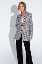 Жакет прямого силуэта, на подкладке. Вырез горловины округлой формы. Перед с центральной застежкой на петли и пуговицы и нагрудными вытачками. Рукав втачной длинный, по низу рукава обработана шлица с пуговицами.