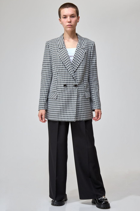 Эффектный удлиненный жакет с принтом "гусиная лапка" является неотъемлемой частью гардероба любительниц стиля casual. Такой жакет подчеркнет элегантность и женственность своей обладательницы, идеален для повседневной носки и отлично дополнит вечерний наряд.
