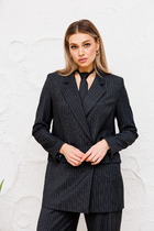 Жакет прилегающего силуэта выполнен из фактурной ткани. Характеристики: прилегающий силуэт, однобортный, подплечники, подкладка, отложной воротник с лацканом, застежка центральная на петлю пуговичку, рукав втачной, по низу рукава пуговички, пуговички в изделии декорированы тканью основного изделия, по переду прорезные карманы с клапаном. Длина по спинке 69 см, длина рукава 64 см.