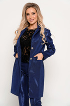 Жакет однобортный. Выполнен из эко-замши. Прямой крой, горизонтальный подрез ниже линии талии, подклад, разреза в спинке нет. Воротник с остроугольным лацканом. Застёжка контрастные петли-пуговицы. Карманы по переду внизу с клапаном без застёжки (функциональные), по груди карман-листочка (нефункциональный). Рукав втачной, на рукваве контрастные петли-пуговицы (нефункциональные), длина 65 см. Длина спинки 77 см