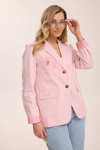 Жакет прямого свободного кроя выполнен из костюмной ткани. Характеристики: прямой свободный крой, подкладка, подплечники, воротник с остроугольным лацканом, застежка центральная на петлю - пуговицу, по переду функциональные карманы с клапаном, рукав втачной, по низу рукава нашиты пуговички, спинка со средним швом, в среднем шве разрез 27 см. Длина по спинке 76, длина рукава 63 см.