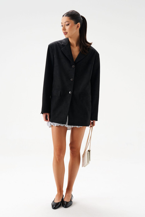 Жакет прямого свободного кроя. Выполнен из эко-замши. Есть подклад. По переду и по спинке кокетки. Воротник отложной с лацканами. Застёжка центральная петли-пуговицы. Рукав втачной, на рукаве петли-пуговицы (нефункциональные). Длина рукава 62 см. По переду внизу карманы с рамкой и с листочкой (функциональные). В среднем шве заднего полотна изделия шлица 24 см. Длина спинки 76 см
