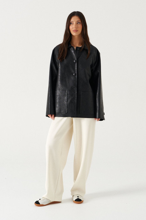 Жакет прямого свободного кроя. выполнен из фактурной эко-кожи чёрного цвета. С подкладкой. Воротник отложной. Рукав втачной, немного спущен. По переду накладные карманы. По окружности жакета подрез ниже линии талии. Спинка отрезная. Застёжка центральная пуговицы. Длина спинки 70 см. Длина рукава от линии втачивания 60 см