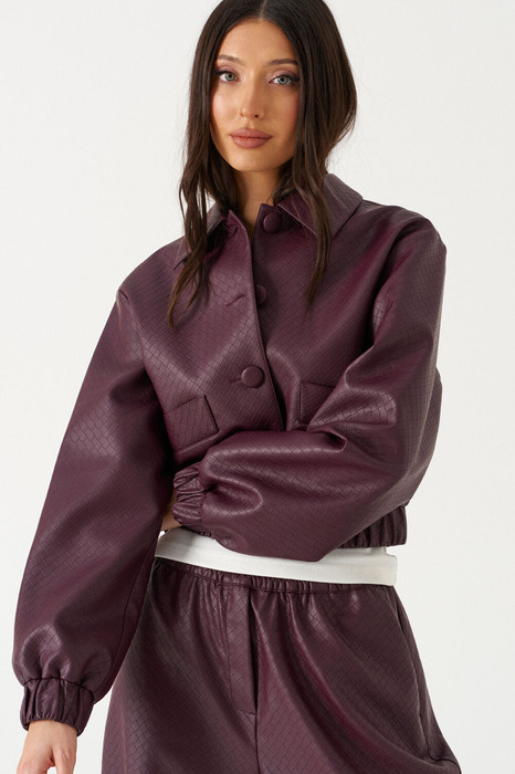 Укороченный жакет. Выполнен из фактурной эко-кожи бордового цвета. С подкладкой. Воротник отложной. Рукав втачной, немного спущен, с мантежой на резинке. Низ изделия с резинкой. По переду прорезные карманы. Застёжка центральная пуговицы. Длина спинки 49 см. Длина рукава от линии втачивания 61 см*жакет дополнит юбка а1611