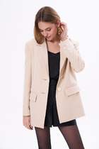 Жакет прямого кроя выполнен из экозамши черного цвета. Характеристики: прямой крой, брендированная покладка, подплечники, отложной воротник с остроугольным лацканом, застежка центральная на петли пуговицы, по линии талии шлевки, в комплекте пояс из ткани основного изделия, рукав втачной. По линии плеча погон с пуговицей, в среднем шве заднего полотна изделия шлица 17 см. В боковых швах изделия карманы. Длина по спинке 65 см, длина рукава 58 см.