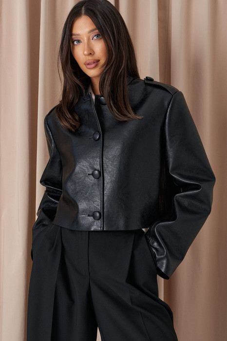 Жакет прямого свободного кроя, выполнен из экокожи черного цвета с теснением. Характеристики: горловина стойка, застежка центральнаяна петли пуговицы,рукав прямой, по плечевому шву пата на пуговице. Длина по спинке 47 см, длина рукава 63 см.