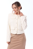 Жакет прямого кроя выполнен из эко-кожи эвкалиптового цвета. Характеристики: прямой крой, покладка, подплечники, отложной воротник с остроугольным лацканом, застежка центральная на петли пуговицы, по линии талии шлевки, в комплекте пояс из ткани основного изделия, рукав втачной. По линии плеча погон с пуговицей, в среднем шве заднего полотна изделия шлица 17 см. В боковых швах изделия карманы. Длина по спинке 65 см, длина рукава 58 см.