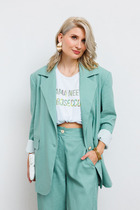 Жакет полуприталенного силуэта выполнен из текстильного полотна черного цвета. Характеристики: полуприталенный силуэт, двубортный, брендированная подкладка, подплечники, овальный вырез горловины, по переду функциональные карманы с клапаном, рукав втачной, по низу рукава нашиты пуговички. Длина по спинке 76, длина рукава 61 см.