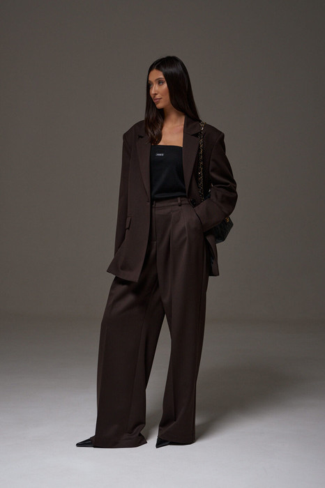 Жакет прямого свободного кроя выполнен из костюмной ткани темно-коричневого цвета. Характеристики: прямой свободный крой, брендированная подкладка, подплечники, воротник с остроугольным лацканом, застежка центральная на петлю - пуговицу, по переду функциональные карманы с клапаном, рукав втачной, по низу рукава нашиты пуговички, спинка со средним швом, в среднем шве разрез 24 см. Длина по спинке 76, длина рукава от линии втачивания 63 см.
