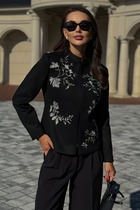 Жакет прилегающего силуэта. Выполнен из костюмный ткани белого цвета. С подкладкой. Воротник-стойка. Вырез горловины V-образный. Рукав втачной, объёмный, заужен к низу. По переду карманы с клапаном. Застёжка центральная - пуговицы. Низ жакета фигурный. Длина спинки 69 см. Длина рукава от линии втачивания 63 см