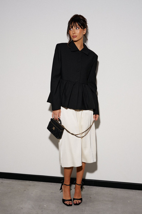 Жакет прямого кроя, с баской по нижней части изделия. Выполнен из костюмной ткани. Характеристики: брендированая подкладка, отложной воротник, застежка центральная на пуговички, рукав втачной. Длина по спинке от края горловины 61 см, длина рукава 83 см.