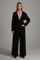 Двубортный жакет на подкладке, прямого силуэта. Обработаны прорезные карманы по переду. Рукава втачные одношовные, обработаны шлицей