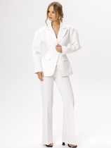 Жакет 2-бортный, на подкладке. Рукав короткий, втачной, одношовный, по окату собран складками дляя увеления объёма. Обработаны талиевые вытачки по переду и спинке изделия