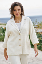 Жакет однобортный, на подкладке, выполнен из эко-замши. Обработан молнией разъёмной молнией по центру переда, закрывающейся планкой с пуговицами. Воротник тложнй, рубашечного типа. Рукава втачные одношвные, прямые. По передним половинкам обрабтаны накладные карманы с клапаном.