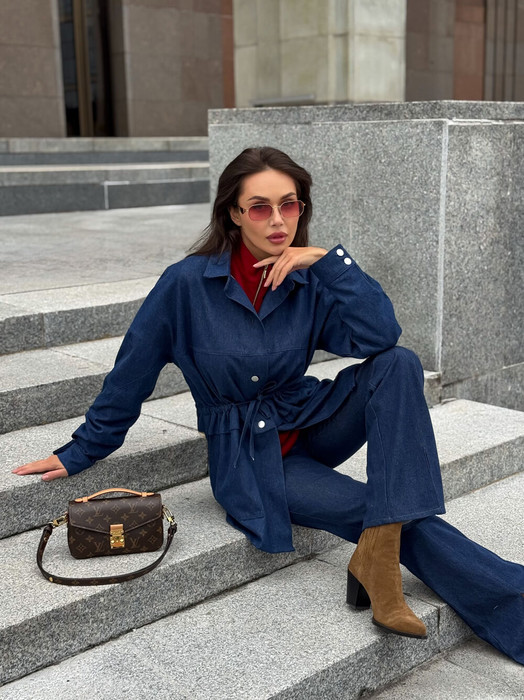 Рубашка из плотной джинсовой ткани, удинённая. Лния плеча спущена, рукав одношовный, обработан манжетой из основной ткани.Воротник рубашечного типа. По талии обработана кулиса и шнурок из основной ткани. Застёгивается на пуговицы.