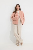 Жакет без подкладки, швы обработаны кантом в цвет изделия. Рукав втачной, прямой, одношовный. Воротник шаль. Застежка на притчной пояс, дополнен съёмной пряжкой золотистого цвета