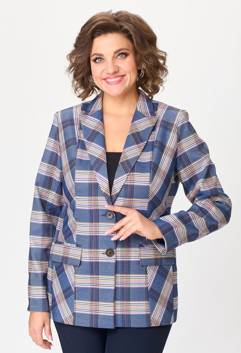 Жакет удлиненный, из текстильной ткани, полуприлегающего силуэта с центральной бортовой застежкой на пуговицы до линии перегиба лацкана. Спереди рельефные швы от плечевого шва, отрезной бочок и карман с клапаном. Спинка с рельефами от плечевого шва. Рукав втачной, двухшовный. Воротник пиджачного типа. Жакет на подкладке, длина по спинке 67 см, длина рукава 62 см