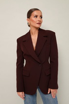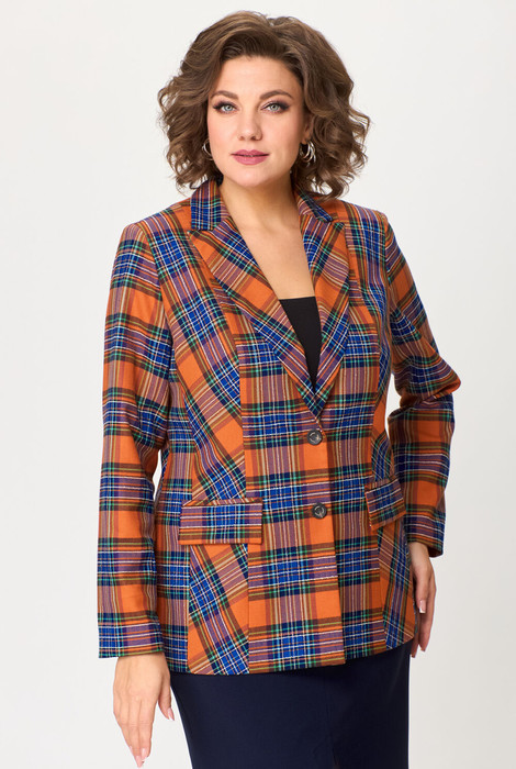 Жакет удлиненный, из текстильной ткани, полуприлегающего силуэта с центральной бортовой застежкой на пуговицы до линии перегиба лацкана. Спереди рельефные швы от плечевого шва, отрезной бочок и карман с клапаном. Спинка с рельефами от плечевого шва. Рукав втачной, двухшовный. Воротник пиджачного типа. Жакет на подкладке, длина по спинке 67 см, длина рукава 62 см