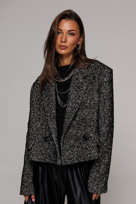 Жакет укороченный прямого силуэта, двубортный с втачным двухшовным рукавом. Полочка с застежкой на петлю-пуговицу и имитацией кармана с клапаном и отрезным бочком. Спинка с отрезным бочком и центральным швом.  Воротник пиджачного типа с отрезной стойкой. Жакет на подкладке.