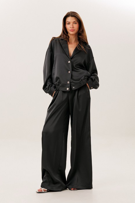 Жакет прямого силуэта до линии бедер, со спущенной линией плеча. Рукав двухвовный со шлицей. По низу манжета на одну кнопку. По переду прорезные карманы. По низу пояс слегка собран на эластичную резинку. Застежка на кнопки.