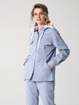 На левом лацкане вышивка-логотип в контрастном цвете. Низ и борта имеют открытые края (эффект необработанного шва), укреплены дополнительной строчкой. Жакет без подкладки.
