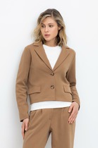 Жакет с центральной застежкой на петли и пуговицы, с втачным воротником с отрезной стойкой, с V-образным вырезом горловины. По переду с рельефами, выходящими из плеча до низа. Низ жакета фигурный. По рельефам переда- разрезы. Спинка со средним швом, рельефами, выходящими из плеча до низа.