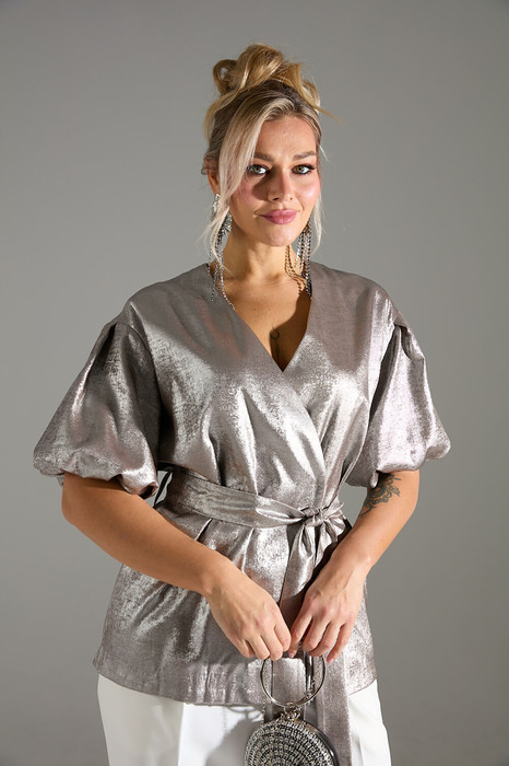 Легкий жакет на подкладке с объёмными рукавами. Перед на запах с застежкой на кнопки, под пояс по талии.