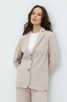 Жакет полуприлегающего силуэта с центральной застежкой на петли и пуговицы. Край борта фигурной формы. Рукав втачной длинный со шлицей. На шлице рукава пуговица. Воротник рубашечного кроя. По спинке средний шов и рельефы.