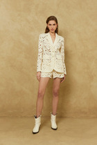 Жакет прямого силуэта с фигурным низом из трикотажного полотна. Горловина округлая, по центру застежка на кнопки. Рукав со спущенной линией плеча. По переду накладные карманы. Жакет без подкладки. Обращаем ваше внимание, что фурнитура может отличаться от фото.