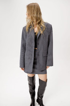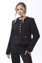 Жакет женский полуприлегающего силуэта на двубортной застёжке на четыре пуговицы. По спине средний шов со шлицей. Карманы прорезные с клапанами и двумя обтачками. Рука двухшовный со шлицей и декоративными пуговицами. Жакет на полной подкладке
