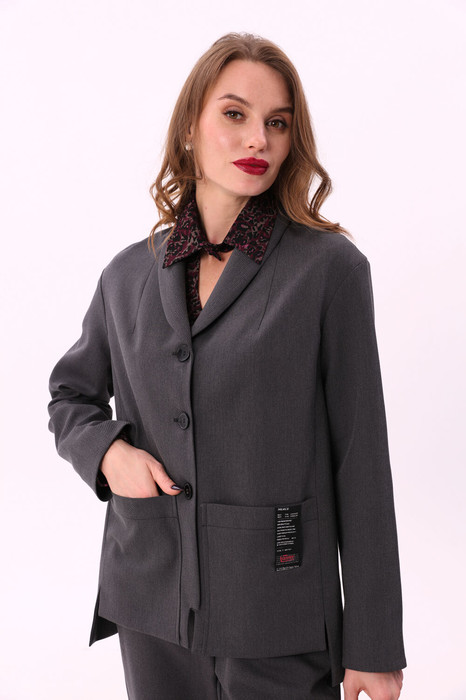Жакет свободного прямого силуэта со слегка заниженной линией плеча. Однобортная застёжка на петли и пуговицы. По переду два больших накладных кармана, на левом кармане нашивка. Воротник шалевый цельнокроенный. Спинка с центральным швом. Изделие на подкладке.