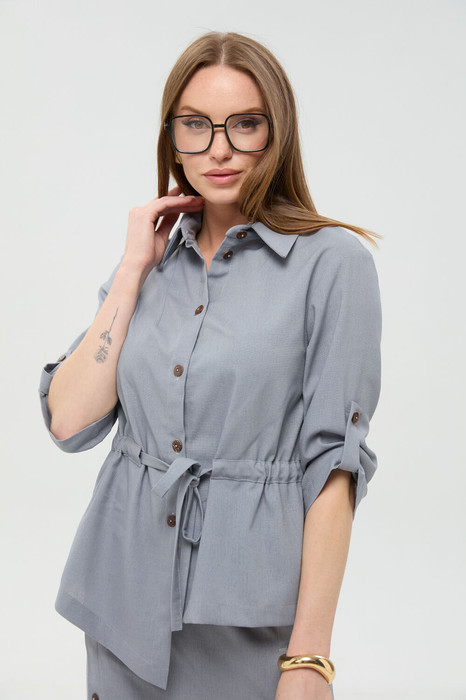 Жакет прямого силуэта, воротник пиджачного типа, рукав одношовный, втачной с незначительно спущенной линией плеча, длиной три четверти, с патой. По линии ткани настрачная кулиса с завязками из основной ткани. Застежка центрально-бортовая. Линия низа верхней части фигурная ассиметричная.