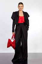 Жакет прямого силуэта, воротник пиджачного типа, рукав одношовный, втачной с незначительно спущенной линией плеча, длиной три четверти, с патой. По линии ткани настрачная кулиса с завязками из основной ткани. Застежка центрально-бортовая. Линия низа верхней части фигурная ассиметричная.