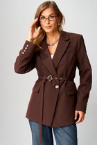 Жакет прямого силуэта с имитацией центральной застёжки на пуговицы. Рукав втачной одношовный, длиной три четверти,застегивающийся на пату. Воротник пиджачного типа . Линия низа фигурная, симметричная . По левому переду расположена декоративная деталь.