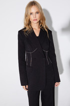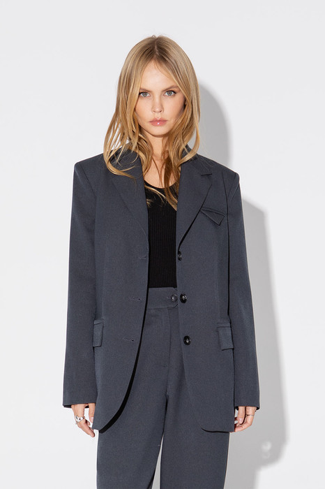 Свободный жакет с разрезами по низу рукавов. Детали: жакет прямого силуэта, пиджачный воротник, перед с прорезными функциональными карманами, нагрудный декоративный карман, однобортная застежка на петли и пуговицы, спинка со средним швом, рукава втачные двухшовные с разрезами по низу, жакет на подкладке.