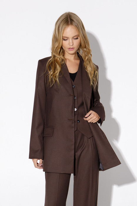 Текстильный жакет трапециевидного силуэта с высокой шлицей по спинке. Детали: свободный покрой, пиджачный воротник, талиевые вытачки, функциональный нагрудный карман, прорезные карманы с клапанами, застежка на пуговицы, спинка со средним швом и высокой шлицей, рукава втачные двухшовные, жакет на подкладке.