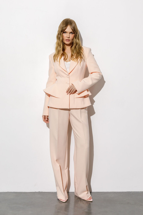 Детали: полуприлегающий силуэт, рельефы переда и спинки, пиджачный воротник, перед с отлетными деталями, застежка на петли и декоративные пуговицы, отрезная линия талии по спинке, втачные длинные рукава со шлицами, жакет на подкладке.