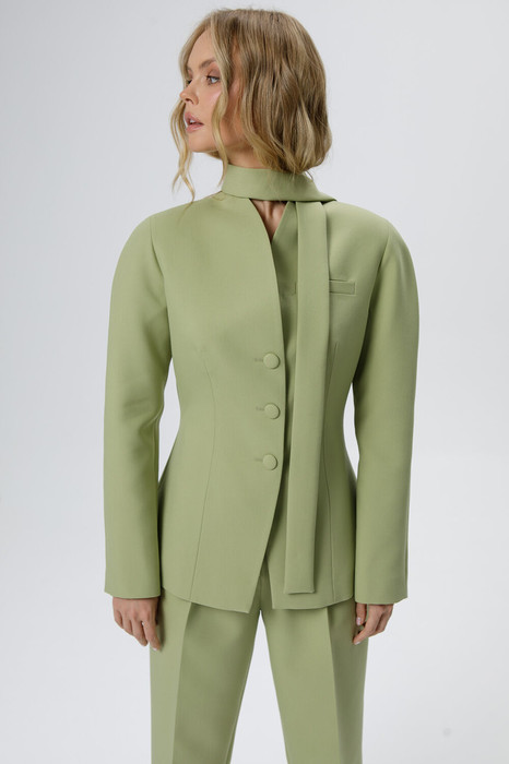 Приталенный жакет с акцентными плечами и воротником-стойкой.