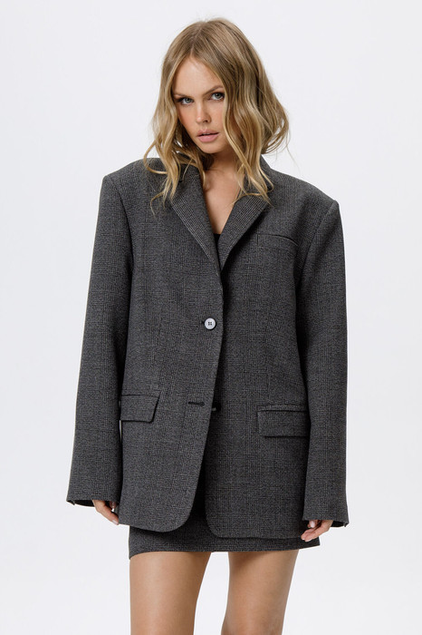 Детали: жакет прямого силуэта, расширенная линия плеч, пиджачный воротник, перед с функциональными карманами, однобортная застежка на петли и пуговицы, спинка со средним швом и шлицей, рукава втачные двухшовные, жакет на подкладке