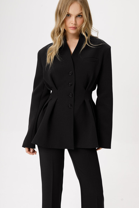 Детали: полуприлегающий силуэт с расширенными плечами, цельнокроеный воротник-стойка, застежка на петли и пуговицы, рукава втачные двушхшовные, жакет на подкладке