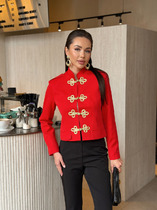 Детали: полуприлегающий силуэт, цельнокроеный воротник-стойка, двубортная застёжка на петли и пуговицы, рельефные швы переда и спинки с декоративным элементом, рукава длинные с вырезами по верху, функциональные карманы, жакет на подкладке.