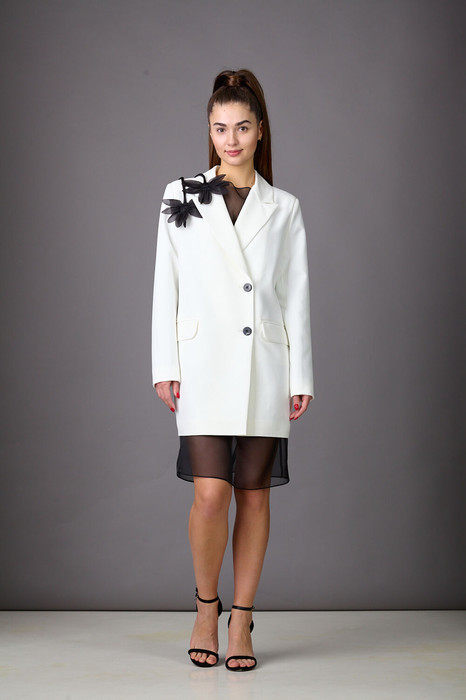 Ах, какая находка - жакет из костюмной молочной ткани с нежными ромашками-брошами! Жакет на подкладке прямого силуэта с двубортной застежкой, прорезными карманами с клапанами и воротником пиджачного типа. Рукава двухшовные, длинные. Идеален для комплектов с платьями- комбинациями, юбками, брюками. Длина жакета 44-48р - 82см , 50-54р- 84см