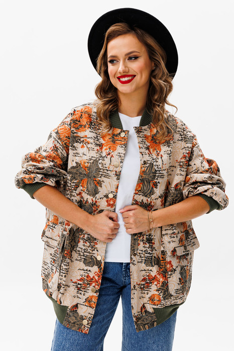 Яркая и стильная куртка-бомбер с уникальным принтом станет ярким акцентом любого гардероба. Сочетание насыщенных оранжевых и зеленых оттенков с изящным узором добавляет образу индивидуальности. Мягкие трикотажные манжеты и воротник подчеркивают расслабленную эстетику бомбера, делая его идеальным выбором для повседневного стиля. Комфортный крой обеспечивает свободу движений, а универсальность модели позволяет легко сочетать её с джинсами, футболками или даже платьями. Этот бомбер — воплощение современной моды!