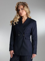Жакет укороченный из костюмной ткани. Застёжка по переду на кнопки. По переду накладные карманы с клапаном. Воротник отложной. Рукав прямой на трикотажной манжете. Низ жакета на трикотажном поясе. Жакет на подкладке.