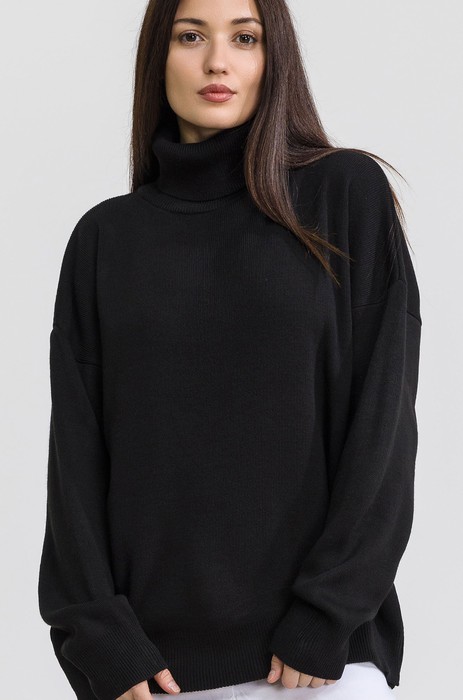 Удлиненный черный свитер выполнен из вязаного трикотажа с добавлением натуральной шерсти и хлопка, что позволяет ему быть очень уютным, мягким и приятным к телу. Женский джемпер с высоким воротом позволит сохранить тепло морозной зимой.