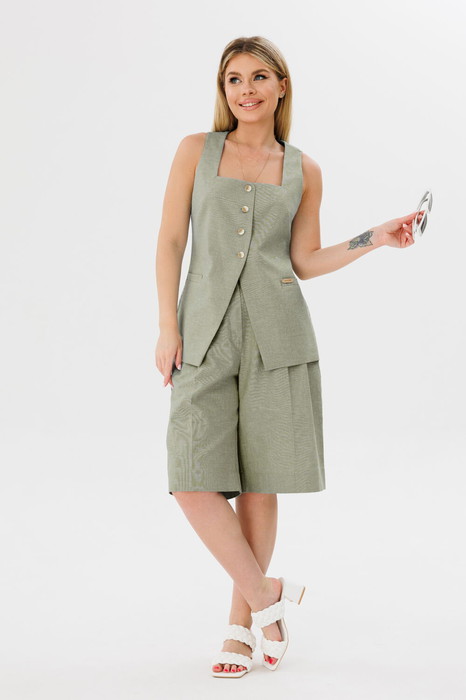 Жилет женский прилегающего силуэта, с вырезом горловины (каре). Застежка по переду на 4 пуговицы. На передних половинках действующие карманы с листочкой. Перед жилета на подкладке.