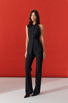 Жилет прямого кроя выполнен из текстильного полотна черного цвета. Характеристики: укороченный, однобортный, прямой крой, брендированная подкладка, застежка центральная на петли - пуговицы, низ изделия по переду с фигурным низом. Длина по спинке от края горловины 36 см