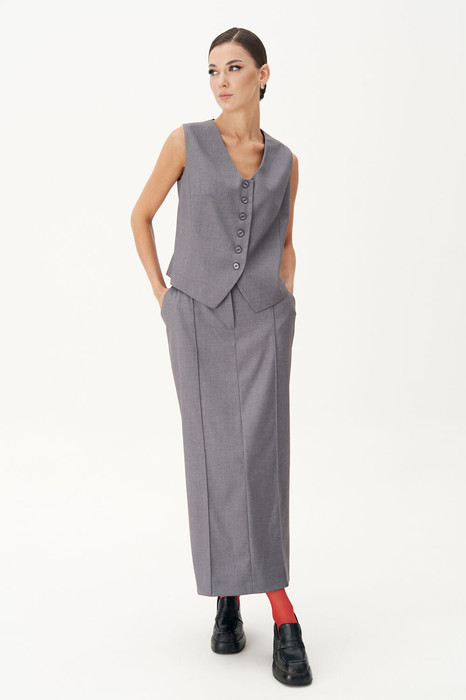 "Жилет классический, полуприлегающего силуэта с центральной застёжкой, фигурным бортом и V-образным вырезом. Полочка с отрезным бочком и нагрудной вытачкой. Спинка с центральным швом, отрезным бочком, талиевой и плечевой вытачкой.