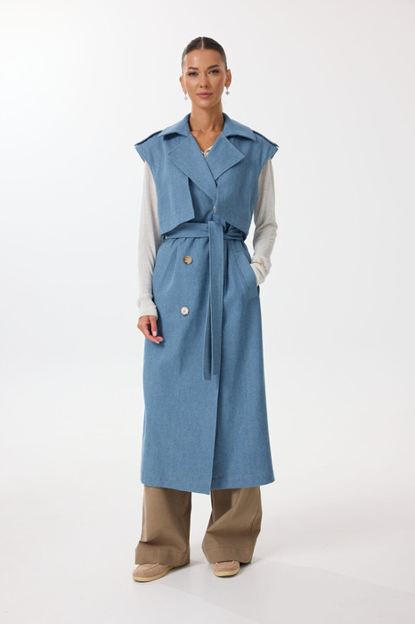 Жилет удлиненный прямого силуэта с центральной двубортной застежкой на петли и пуговицы. По переду обработаны нагрудные вытачки, карманы с наклонным входом с листочкой. Спинка со средним швом, в котором обработана шлица. По спинке и переду выполнены отлетные кокетки с отделочными строчками контрастного цвета. В области талии расположены широкие шлевки для пояса из основной ткани, которым комплектуется жилет. По горловине воротник с отрезной стойкой. В области плечевых швов расположены декоративные паты с пуговицами. Все отделочные строчки выполнены гарусной нитью контрастного цвета.